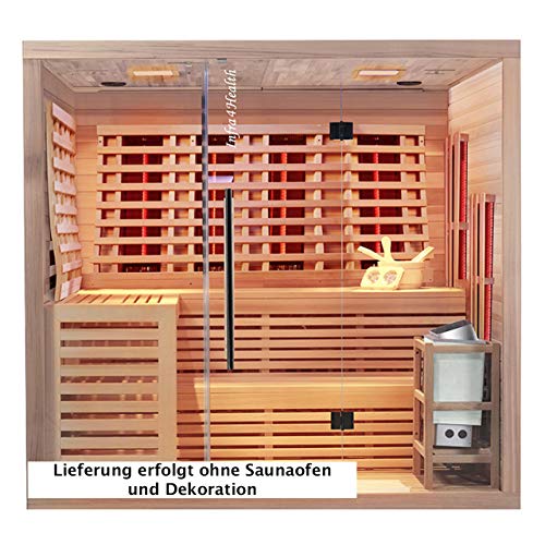 | Info | Infrarot-Wärmekabine Kanadischem Hemlock-Holz 5 Keramikstrahler Temperatur bis zu 60°C Gesamtleistung: 1700 Watt MP3-Player USB-Anschluss Stabile Sitzbank Getränkehalter 230 Volt (230v) | Infrarotsauna Für 1-2 Personen Kanadisches Hemlock Tannenholz Temperaturbereich von 30°C bis 65°C 6 Vollspektrumstrahler Bluetooth, SD-Karte, MP3, USB, FM Radio LED-Farblichttherapie Sicherheitsglas-Tür | Infrarotsauna Für 1-2 Personen Kanadisches Hemlock Tannenholz Temperaturbereich von 30°C bis 65°C 5 Vollspektrum-, 4 Karbonstrahler Seite 1 Karbonstrahler im Boden Bluetooth, SD-Karte, MP3, USB, FM Radio LED-Farblichttherapie Sicherheitsglas-Tür | Infrarot-Wärmekabine Kanadisches Hemlock-Holz 5 Keramik- und 7 Flächenstrahler Temperatur bis zu 65°C Gesamtleistung: 3450 Watt LED Lichttherapie MP3-Player FM-Radio & Bluetooth 230 Volt (230v) |