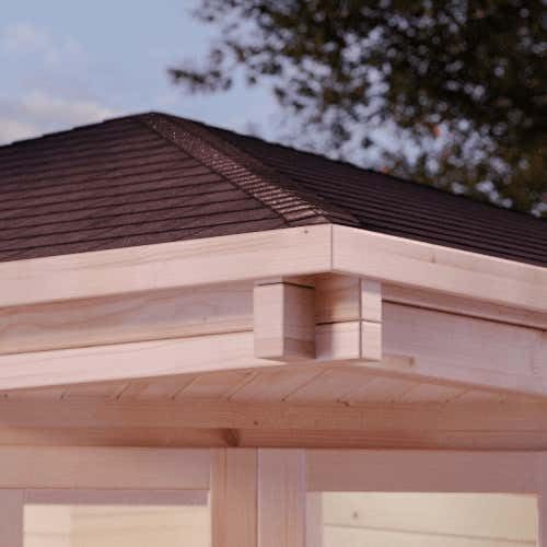 – 70 mm starke Blockbohlen mit 4-fach Eckausfräsung für beste Wind- und Regendichtigkeit