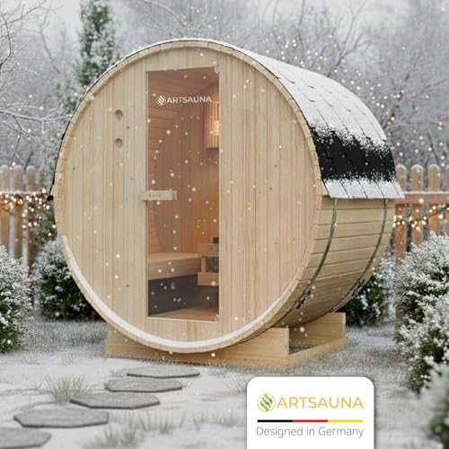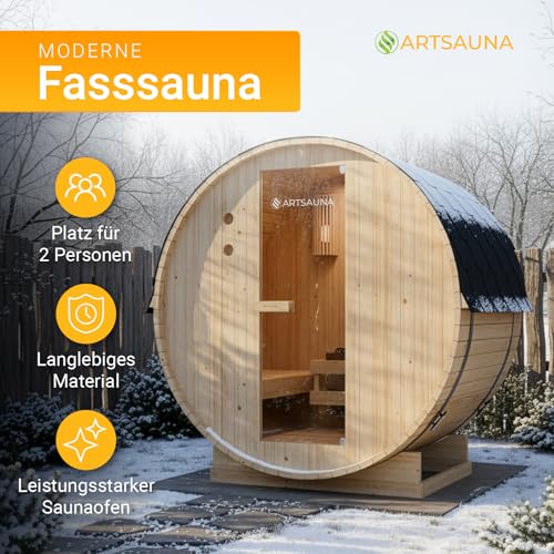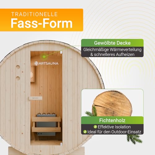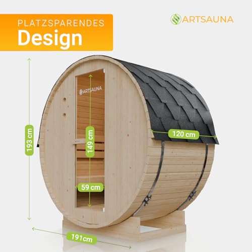 Artsauna Outdoor Fasssauna Spitzbergen 120 für 2 Personen – 3,6 kW Ofen, Saunasteine & Zubehör – Saunafass aus Fichtenholz – Außensauna Gartensauna