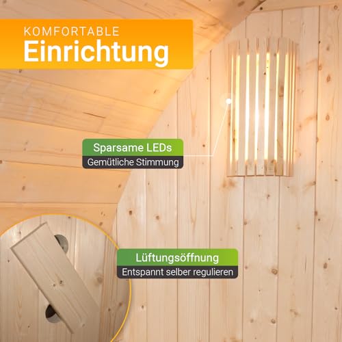 - ✅ Sauna Komplettset: Sofort einsatzbereit; Saunafass mit Sanduhr & Thermo-Hygrometer; praktisches Aufguss-Set; mit LED-Beleuchtung für gemütliches Licht & zum Lesen