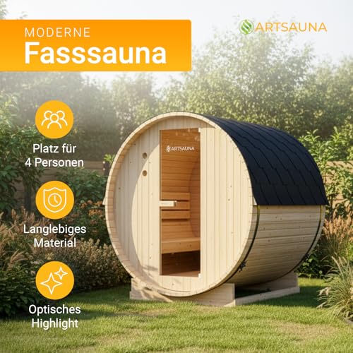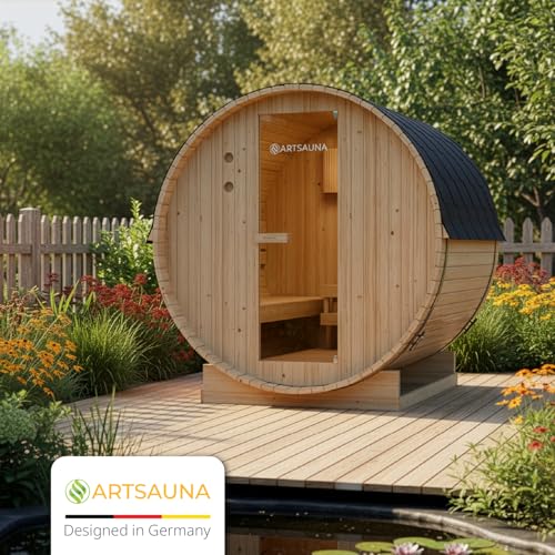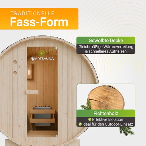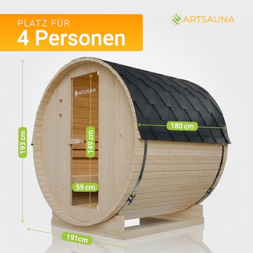 Artsauna Outdoor Fasssauna Spitzbergen 180 für 4 Personen – 6 kW Ofen, Saunasteine & Zubehör – Saunafass aus Fichtenholz – Außensauna Gartensauna