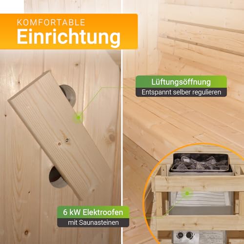 - ✅ Leistungsstarker Saunaofen: Elektrischer 6 kW Ofen mit Steinen; für einen wohltuenden Aufguss; inklusive Aufgusseimer & Löffel aus Holz; Wellness pur im eigenen Außenbereich