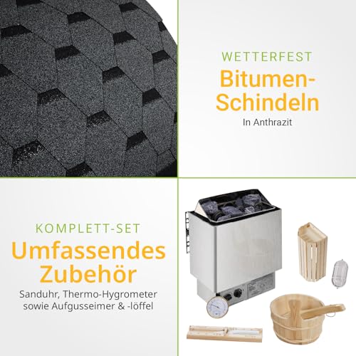 - ✅ Witterungsbeständige & langlebige Gartensauna: Aus hochwertigem & robustem Fichtenholz gefertigt; mit schützenden Dachschindeln aus Bitumen; ideal für den Außenbereich