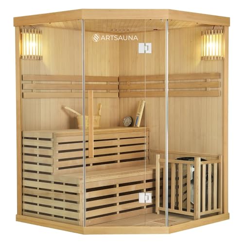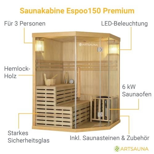 Entdecken Sie die hochwertige Saunakabine Espoo150 Premium von Artsauna. Die Kabine aus hellem Hemlockholz mit einem echten finnischen Harvia Ofen bietet Platz für bis zu drei Personen. Die hitzebeständige Glasfront sorgt für Entspannungsmomente und das Komplett-Set mit Zubehör macht den Aufbau und die Nutzung besonders komfortabel.