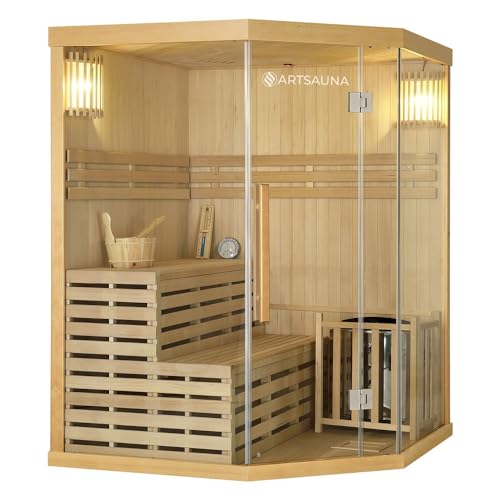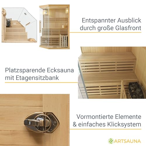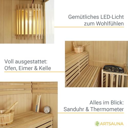 Artsauna Saunakabine Espoo150 Premium mit Harvia Ofen — 3 Personen — Hemlock Holz, Glasfront und LED Licht — Inkl. Thermometer & Sanduhr —Komplett Set
