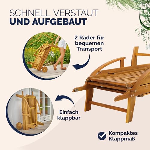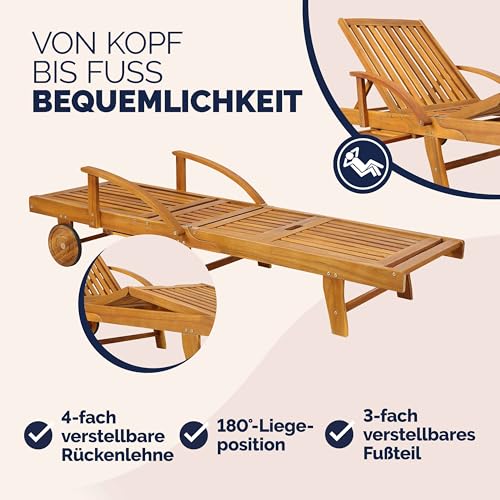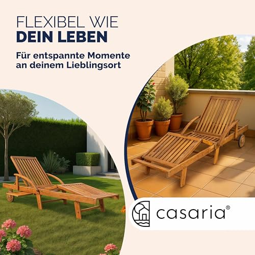 - HOCHWERTIGE HOLZLIEGE: Die bequeme und robuste Gartenliege Tami Sun von CASARIA lädt zum Entspannen ein. Hergestellt aus witterungsbeständigem Akazienholz in moderner Optik, macht diese Strandliege im Innen- sowie im Außenbereich etwas her.