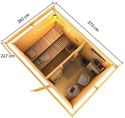 • Bauweise: Steck-Schraub-System, Außenmaß Breite: 337 cm, Außenmaß Tiefe: 231 cm, Material: Nordische Fichte