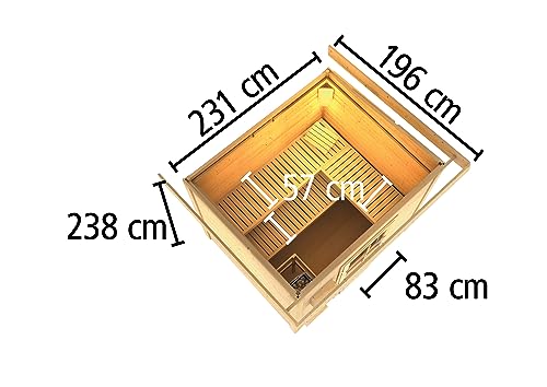 - Alles im Set inkl. finnischem Saunaofen 9kW mit integrierter Steuerung in 41x50x37cm BxHxT. (Bei der Installation wird ein Elektriker empfohlen)