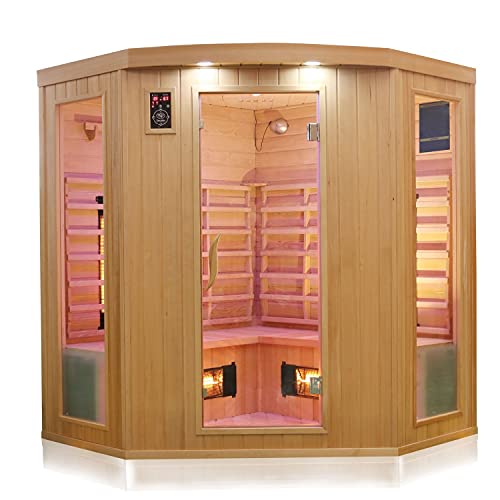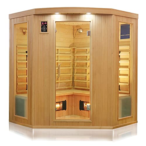 Dewello® Infrarotkabine Infrarotsauna Haley 160×160 für 2-4 Personen aus Hemlock Holz mit Vollspektumstrahler, Bodenstrahler, LED-Farblicht, Bluetooth, FM,MP3,USB