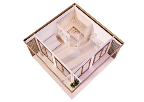 - GENÜGEND PLATZ: Die 480 x 480 cm große Außensauna bietet genügend Platz für 5 Personen, mit 3 integrierten Liegeflächen.
