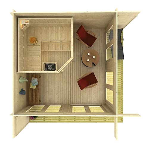 - MIT VORRAUM: In dieser Garten-Sauna ist neben dem Hauptraum auch ein Vorraum verbaut. Dieser Raum bietet zusätzlichen Platz und kann zur Ruhe oder zum Umziehen genutzt werden.