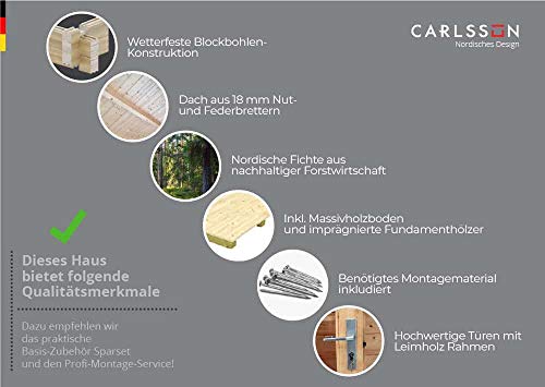 – Bitte beachten Sie, dass der Fußboden und die Fundamenthölzer nicht im Lieferumfang enthalten sind und separat erworben werden müssen.