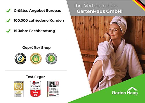 - QUALITATIV HOCHWERTIG: Die Außensauna ist gefertigt in stabiler Blockbohlenbauweise aus Nordische Fichte, welches durch seine Robustheit für eine besonders lange Lebensdauer sorgt. Die 4-fach Eckausfräsung und das Nut-, Federprofil gewährt eine besonders feste, wind- und wasserundurchlässige Verbindung. Somit eignet sich diese Sauna ideal zum Aufbau im Freien. Wegen der erhöhten Strahlungswärme, die das Holz aufnimmt, sorgt die Massivholzsauna auch für ein besseres Wohlbefinden.
