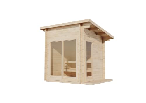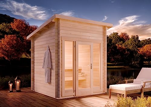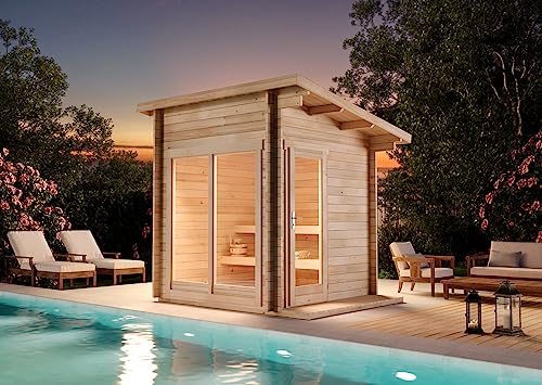 - MODERNES DESIGN: Gestalten Sie mit dem modernem Design der Außensauna, ihre ganz eigene Wellness Oase im Garten. Unterschützt wird das moderne Design durch das Pultdach und die Panorama-Tür.