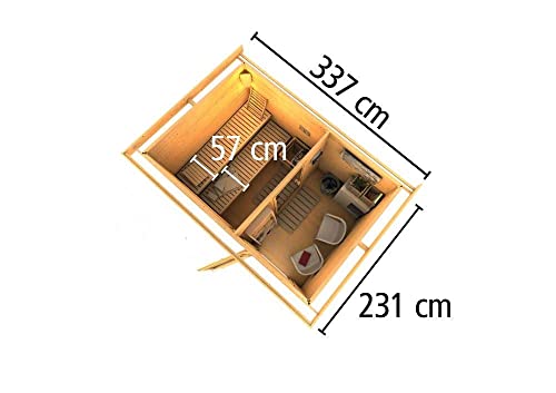 - GENÜGEND PLATZ: Die 357 x 267 cm große Außensauna bietet mit 2 integrierten Liegeflächen genügend Platz für 6 Personen. Die Gesamthöhe beträgt 277 cm. Zudem ist ein Vorraum mit verbaut, welcher zusätzlichen Platz für Liege und Sitzmöglichkeiten