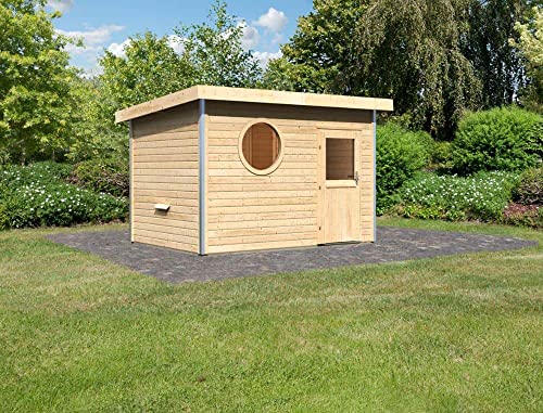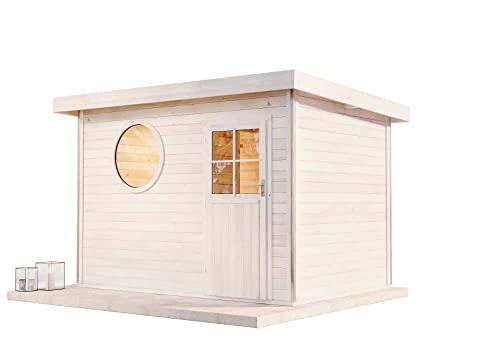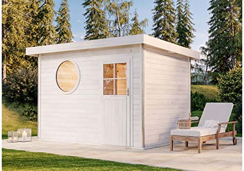 - MODERNES DESIGN: Gestalten Sie mit dem modernen Design der Außensauna ihre ganz eigene Wellness Oase im Garten. Unterschützt wird das moderne Design durch das Flachdach und die Halbglas-Tür.