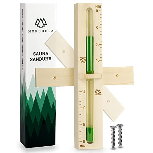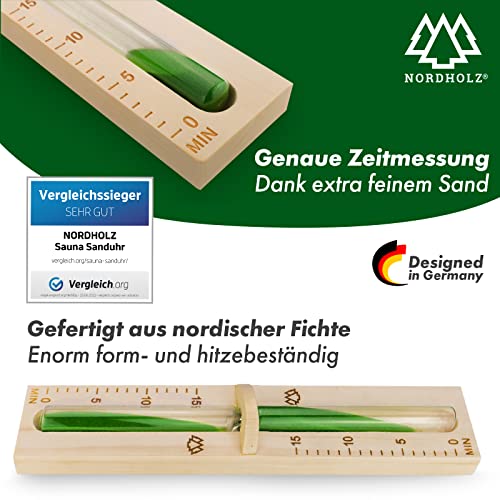 NORDHOLZ® Sauna Sanduhr 15 Minuten aus 100% nordischer Fichte – Glas robust & hitzebeständig – Kontrastfarbe Grün + 2 Edelstahl Schrauben – Sauna Zubehör – 60 Tage risikolos testen – Saunauhr