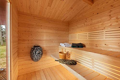 - EINZIGARTIGES SAUNAERLEBNIS: Aufgrund der hervorragenden Wärmedämmkapazität der nordischen Fichte, sorgt die Outdoor-Sauna für eine maximale Entspannung und mindert Stress und Verspannungen. Verwöhnen Sie Ihren Körper mit ein paar Saunagängen und beugen sie Beschwerden vor.