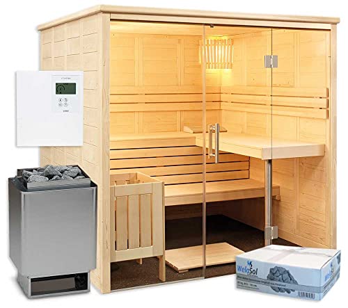 - Exclusive Massivholz Saunakabine mit geradem Einstieg und Glasfront | Maße 2,08 m x 2,06 m x 2,04 m | inklusive Finnischer Saunatechnik