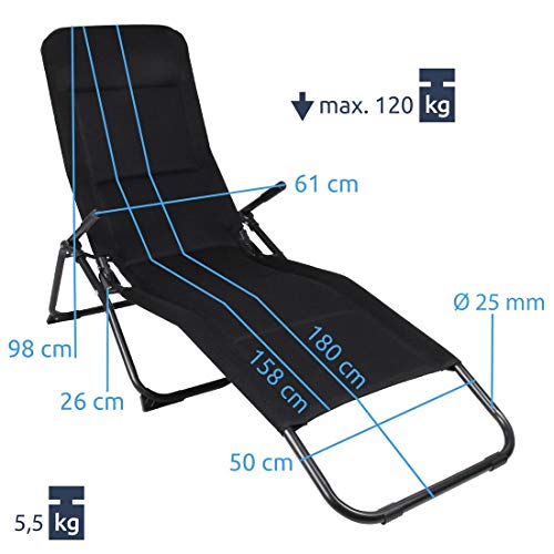 Die Maße betragen 61 cm Rahmenbreite, 50 cm Breite der Liegefläche, 180 cm Länge der Liegefläche mit Fußteil, Höhe von 26/98 cm, ein Gewicht von 5,5 kg und eine max. Belastbarkeit von 120 kg. Die Gartenliege ist in Dunkelanthrazit erhältlich und perfekt für den Garten, Sauna, Schwimmbad, Campingurlaub, Caravan oder die Terrasse. yourGear ist eine deutsche Marke.